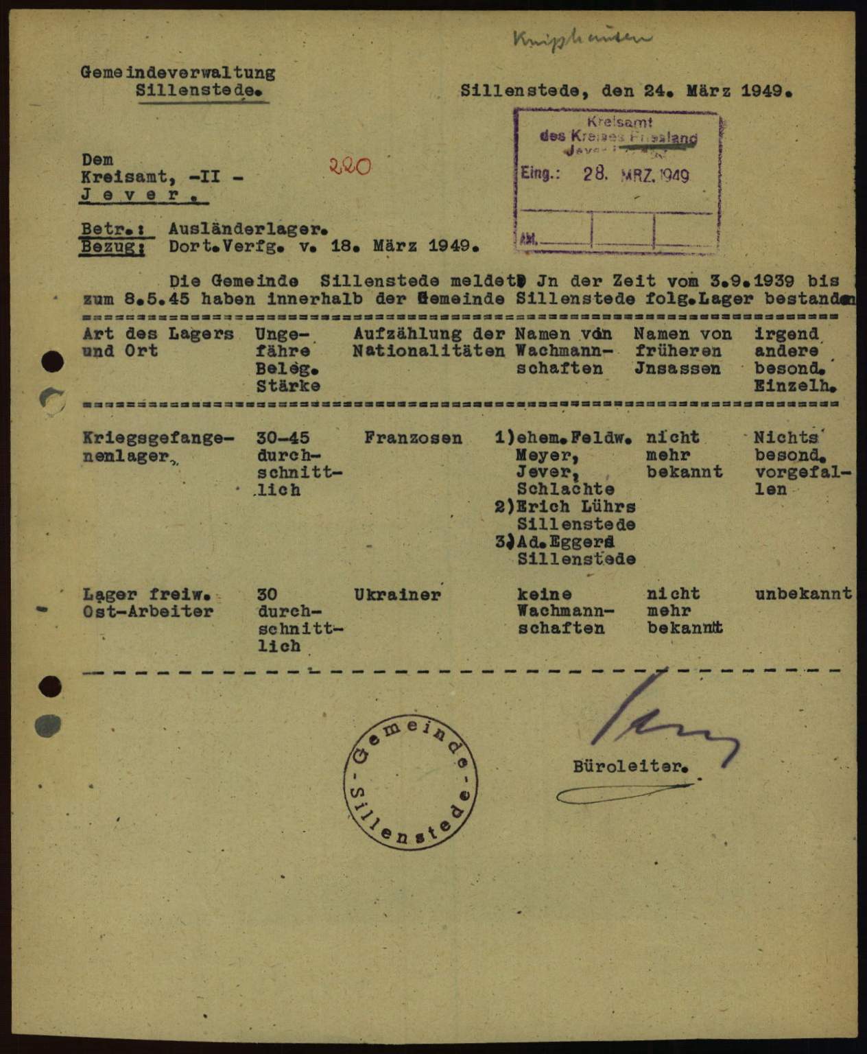 Der Ort Sillenstede liegt östlich von Jever in der Region Kniphausen. Das dortige Arbeitskommando wurde 1940 für 30 bis 45 französische Kriegsgefangene eingerichtet. Im August 1943 lag die Belegung bei 22 Franzosen. Ihr Vertrauensmann war Robert Huguet, Erkennungsnummer 4600. Alle Gefangenen waren in der Landwirtschaft eingesetzt.